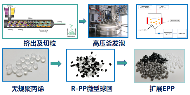 把特種處理的聚丙烯微晶顆粒,放入高壓(50大氣壓)和高溫(150℃)的高壓釜中,用CO2作為發泡劑浸漬,可以制備出發泡聚丙烯顆粒。